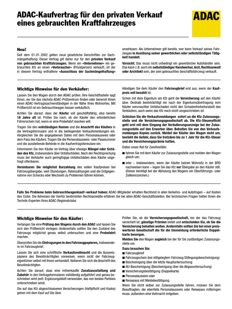 Adac kaufvertrag für den verkauf eines gebrauchten kraftfahrzeuges von einem unternehmer an einen unternehmer vertragsformular und verkaufsmeldungen bitte vollständig ausfüllen und unterschreiben.